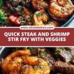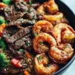 A flavorful and colorful Steak Shrimp Stir Fry combining tender sirloin steak and succulent shrimp with vibrant vegetables, all tossed in a savory and slightly sweet sauce. This quick and easy stir-fry is perfect for a weeknight dinner served over steamed rice and garnished with sesame seeds and green onions.
