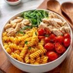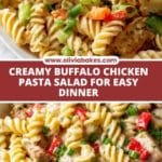 A delicious and creamy Buffalo chicken pasta salad featuring tender rotini pasta, juicy cooked chicken, crisp vegetables, and a tangy buffalo-ranch dressing. Perfect as a refreshing, spicy side or a hearty main dish for any gathering or meal.