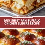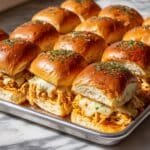 These Sheet Pan Buffalo Chicken Sliders are an easy, crowd-pleasing appetizer featuring shredded rotisserie chicken tossed in spicy buffalo sauce and creamy ranch dressing, topped with mozzarella and Parmesan cheese, all sandwiched in soft King’s Hawaiian rolls. Baked to melted cheesy perfection and brushed with a seasoned buttery glaze, these sliders are perfect for game day or casual gatherings.