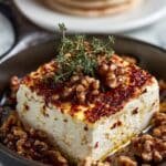 - Add Toppings and Serve: Sprinkle the toasted walnuts, fresh herbs if using, and cracked black pepper over the caramelized feta. Serve immediately while hot, accompanied by warm pita, flatbread, or crusty bread.