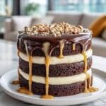 Decadent Chocolate Snickers Cake featuring rich cocoa layers, creamy nougat filling, luscious caramel, and smooth chocolate ganache topped with crunchy salted peanuts. This indulgent dessert combines classic Snickers flavors in a beautiful layered cake, perfect for special occasions.