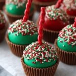 Delight in these festive Oreo Truffles, beautifully decorated for the Christmas season. Creamy, smooth truffle centers made from finely crushed Oreos and cream cheese are dipped in vibrant green and red melting wafers, then topped with miniature Reese’s Cups, colorful Christmas sprinkles, and licorice candy ornament hooks. Perfect as holiday treats or gifts, these no-bake, easy-to-make truffles combine rich chocolatey goodness with charming seasonal decorations.