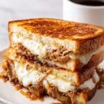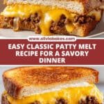 This Classic Patty Melt Sandwich features juicy seasoned beef patties layered with cheddar and provolone cheeses, all grilled between buttered rye bread slices with a flavorful homemade sauce. Perfectly seared and melted, this indulgent sandwich delivers a comforting blend of savory flavors and textures in every bite.
