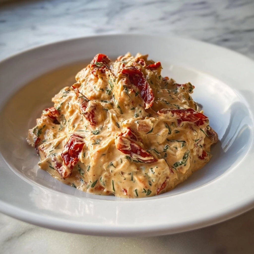 The dish shows a thick creamy mixture piled in a small mound on a white plate. The base layer has a pale orange sauce with visible specks of green herbs mixed throughout. Scattered deeply inside are chunks of bright red sun-dried tomatoes, adding color and texture contrast. The texture looks rich and smooth but with some fibrous pieces giving it a slightly chunky look. The plate sits on a white marbled surface with soft natural light highlighting the dish’s creamy shine. photo taken with an iphone --ar 1:1 --v 7 — Creamy Crockpot Marry Me Chicken, slow cooker chicken recipes, creamy chicken dinner, easy weeknight chicken, comforting chicken meals