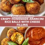 Deliciously crispy Arancini Italian Rice Balls made from leftover risotto, stuffed with gooey mozzarella cheese, coated with breadcrumbs, and fried to golden perfection. Served with a tangy marinara dipping sauce, these bite-sized treats are perfect as an appetizer or snack.