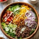 This Crispy Rice Cheeseburger Salad combines the beloved flavors of a cheeseburger with a fresh, vibrant salad base and a delightful crunch from oven-baked crispy rice. Featuring seasoned ground beef, shredded cheddar, cherry tomatoes, pickles, and a tangy dill pickle ranch dressing, this salad is a satisfying and easy-to-make dish perfect for lunch or dinner.