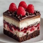 This Dark Chocolate Raspberry Cheesecake combines a rich chocolate crust with a creamy, luscious chocolate-infused cheesecake filling studded with fresh raspberries. Topped with light whipped cream and garnished with raspberries and chocolate shavings, this dessert offers a decadent balance of tart and sweet flavors perfect for special occasions or indulgent treats.