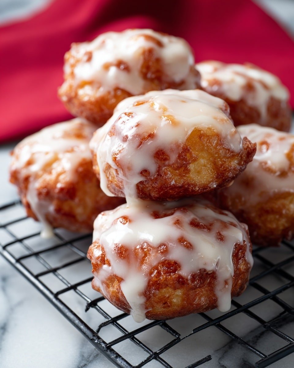- Dip warm fritters gently into the glaze, letting the excess drip off before placing them back on the rack. The glaze sets in 10-15 minutes into a silky, sweet finish that’s utterly addictive. Serve warm for the best experience.