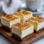 6. Serve: Once chilled, use the parchment paper overhang to lift the bars from the pan. Cut into squares and dust the tops with powdered sugar or a gold edible shimmer for an elegant finish.