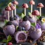 These Forbidden Forest Blackberry Cheesecake Pops are delightful no-bake treats featuring creamy cheesecake mixed with a luscious blackberry swirl, coated in rich dark chocolate and decorated with edible glitter for a magical finish. Perfect for parties or a whimsical dessert, they combine the fruity tartness of blackberries with the smoothness of cheesecake in a fun, bite-sized pop.