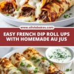 Delicious French Dip Tortilla Roll Ups are a creative twist on the classic French dip sandwich, featuring thinly sliced roast beef and melted mozzarella or provolone cheese rolled inside soft flour tortillas. Baked to golden perfection with a flavorful butter and herb coating, these bite-sized roll ups are served with a savory au jus dipping sauce made from beef broth and seasonings. Perfect as an appetizer or snack, they offer a gooey, crispy, and savory experience.