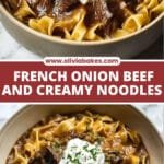 A comforting and hearty Crock Pot French Onion Beef and Noodles recipe featuring tender beef slow-cooked with caramelized onions, rich French onion soup flavors, and creamy cheese, served over tender egg noodles and topped with crispy French fried onions for an irresistible meal.