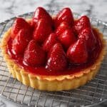 A classic French Glazed Fresh Strawberry Tart featuring a crisp Pâte Sablée crust, smooth Vanilla Crème Pâtissière custard, and fresh strawberries glazed with apricot jam for a beautiful, elegant finish. Perfect as a refreshing dessert for any occasion.