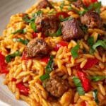Greek Beef Orzo Pasta is a hearty and comforting one-pot meal featuring tender beef chuck simmered in a rich tomato and spice-infused broth with orzo pasta. This flavorful dish is enhanced with aromatic cinnamon, bay leaves, and allspice, finished with a sprinkle of Parmesan cheese and fresh parsley for a delicious and satisfying dinner.