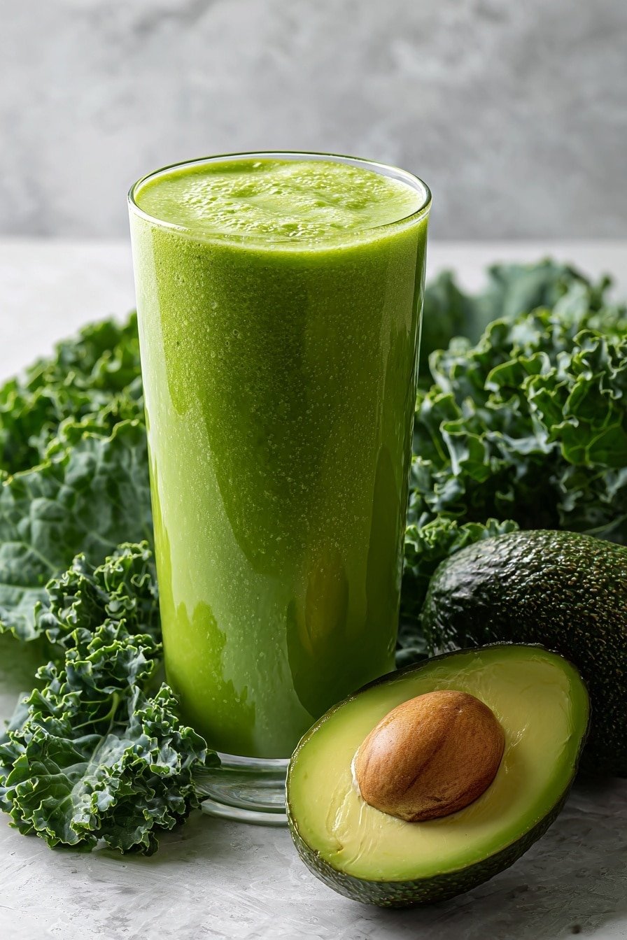 A clear glass filled nearly to the top with a thick, bright green smoothie, smooth in texture with tiny bubbles visible on the surface. Around the glass, fresh spinach leaves and a halved avocado with a large brown seed are placed on a white marbled surface. The background is dark green, giving contrast to the vibrant green colors of the smoothie and vegetables. photo taken with an iphone --ar 2:3 --v 7 — Healthy Green Smoothie, green smoothie recipe, nutritious green smoothie, healthy breakfast drinks, fresh fruit and greens smoothie