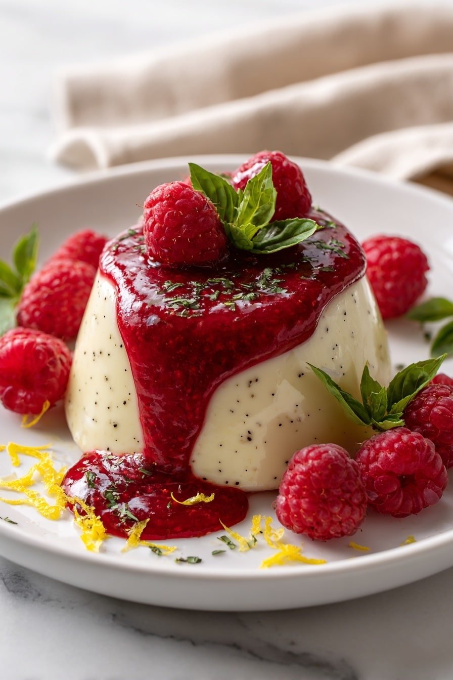 There’s something truly magical about a dessert that feels both elegant and homey—like the Lemon Basil Panna Cotta with Raspberry Sauce Recipe. When I make this, it always reminds me of calm weekend afternoons spent savoring quiet moments, a velvety spoonful at a time. The delicate basil aroma mingling with fresh lemon zest brings a subtle freshness that perfectly matches the silky cream. You’ll notice how the panna cotta sets into a lightly crisp but smooth texture, almost like a soft cloud that melts on your tongue. Paired with the bright, tangy raspberry sauce, it’s a balance of flavors and textures that feels both refreshing and indulgent. This recipe is a joy to share with friends or to treat yourself after a busy day—comfort wrapped in a glass. If you love desserts that look impressive but don’t demand hours in the kitchen, you’re going to enjoy making this. I love how the infusion step lets the basil and lemon perks leap through the cream without overpowering the delicate finish. It’s a small detail that makes all the difference.🔥