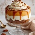 A luscious no-bake Maple Pecan & Pumpkin Cheesecake Trifle featuring layers of creamy pumpkin cheesecake mousse, maple-whipped cream, crunchy maple-glazed pecans, and spiced cookie or cake crumbs. This dessert combines autumnal flavors like pumpkin, maple, and warm spices into an elegant layered trifle perfect for fall gatherings or holiday celebrations.