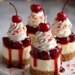These Mini Christmas Tree Cheesecakes are a delightful festive treat featuring a buttery graham cracker crust, creamy cheesecake filling, and a festive cranberry topping shaped like Christmas trees with whipped cream. Perfect for holiday celebrations, these bite-sized cheesecakes combine tangy and sweet flavors with a beautiful presentation.
