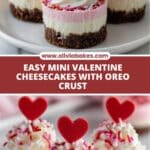 Delight your loved ones with these adorable Mini Valentine Cheesecakes featuring a rich Oreo crust, creamy pink cheesecake filling, and optional festive whipped cream and sprinkles. Perfect for Valentine’s Day or any romantic occasion, these bite-sized treats are easy to make and irresistibly delicious.