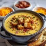 A little mise en place goes a long way with this soup. I like to wash and dice the potatoes first and have the beef bacon ready to crumble before starting. Also, measure out your liquids and shred the cheddar ahead. This saves scrambling while your roux is cooking. Keep your broth warm on the side, and have your immersion blender close — it’ll speed up the blending step beautifully. Ready for comfort food that gels together in under an hour? You’re just that close.Tools & Setup