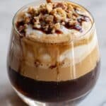 The image shows a clear glass cup filled with three main layers: the bottom layer is a dark, rich brown liquid, the middle layer is a lighter brown creamy foam with a smooth texture, and the top layer is a dollop of thick, light brown cream sprinkled with chopped nuts and drizzled with a dark syrup. The cup is placed on a white marbled surface and the close-up view highlights the contrast between the dark syrup and the creamy textures. photo taken with an iphone --ar 1:1 --v 7 — Peanut Butter Cottage Cheese Mousse, healthy mousse recipes, protein-packed snack ideas, easy healthy desserts, quick breakfast options