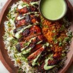 3. Plate beautifully: Fluff the yellow rice with a fork and layer it on your serving dish. Slice the grilled chicken and lay it on top. Then, drizzle generously with your homemade green sauce. You’ll love how the colors and textures sing together — golden rice, crisp-tender chicken, and creamy, fresh sauce.