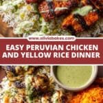 A vibrant and flavorful Peruvian-inspired meal featuring marinated grilled chicken served with turmeric-infused yellow jasmine rice and a creamy cilantro jalapeño green sauce. This recipe offers a perfect balance of zest, spice, and freshness, making it an ideal lunch or dinner option.