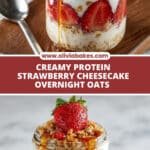 This Protein Strawberry Cheesecake Overnight Oats recipe is a delicious and nutritious make-ahead breakfast option that combines creamy Greek yogurt, tangy cream cheese, and vanilla protein powder with fresh strawberries and rolled oats. It’s easy to prepare, requires no cooking, and provides a perfect balance of protein, fiber, and natural sweetness to keep you energized throughout the morning.