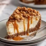 A slice of pie with three visible layers sits on a white plate with a dark rim, placed on a white marbled surface. The bottom layer is a thick, crumbly brown crust. Above this is a creamy, light beige filling with a smooth texture. The top layer consists of a crunchy crumb topping mixed with small beige chunks and drizzled with a rich, glossy caramel sauce that flows slightly over the edges. A silver fork lies next to the pie slice with a little caramel on its tines. photo taken with an iphone --ar 4:5 --v 7 — Salted Caramel Apple Pie Cheesecake, salted caramel apple pie dessert, apple cheesecake with caramel, cozy autumn dessert recipes, easy apple pie cheesecake