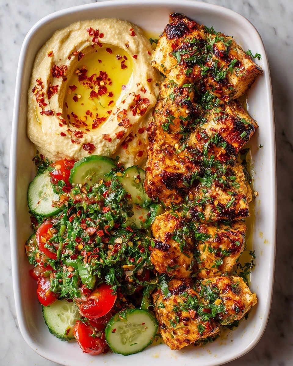- Serve immediately to enjoy the perfect textural combination — hot, spiced chicken; cool, creamy hummus; and crisp, zesty cucumber salad. You’ll appreciate how these elements harmonize on the palate.