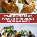 - Assemble the Stuffed Potatoes: When the potatoes are done, remove them from the oven and let them cool for a few minutes so they can be handled safely. Cut each potato lengthwise and use a fork to fluff the inside. Fill the potato shells with the cooked steak pieces. Spoon the warm Parmesan cream sauce over the stuffed potatoes.