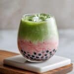 A refreshing and visually appealing Strawberry Matcha Boba drink that combines chewy tapioca pearls with sweet strawberry puree, creamy milk, and vibrant ceremonial grade matcha, perfect for a unique teatime treat.