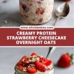 This Protein Strawberry Cheesecake Overnight Oats recipe is a delicious and nutritious no-cook breakfast option that combines creamy Greek yogurt, protein powder, fresh strawberries, and chia seeds for a creamy, satisfying start to your day. The inclusion of cream cheese gives it a cheesecake-like richness, making it both indulgent and healthy.