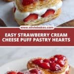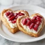 - Fill Pastries: Spoon or pipe 1–2 tablespoons of the cream cheese mixture into the center of each pastry heart, keeping inside the rim to avoid spillage. Top with the remaining diced strawberries. Avoid overfilling to allow the pastry edges to puff properly.