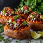 7. Add Toppings and Serve: Transfer the stuffed sweet potatoes to plates and offer toppings such as sour cream or Greek yogurt, avocado or guacamole, salsa, fresh cilantro, sliced jalapeños, and lime wedges. Serve immediately and enjoy!