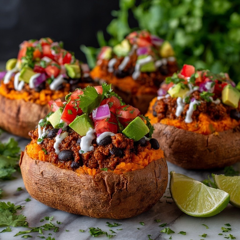 Taco Stuffed Sweet Potatoes are a flavorful and satisfying meal combining tender roasted sweet potatoes with a spicy ground beef taco filling, black beans, and corn. Finished with melted cheese and fresh toppings like sour cream, avocado, salsa, and cilantro, this recipe offers a delicious twist on traditional tacos with a nutritious, gluten-free base.