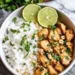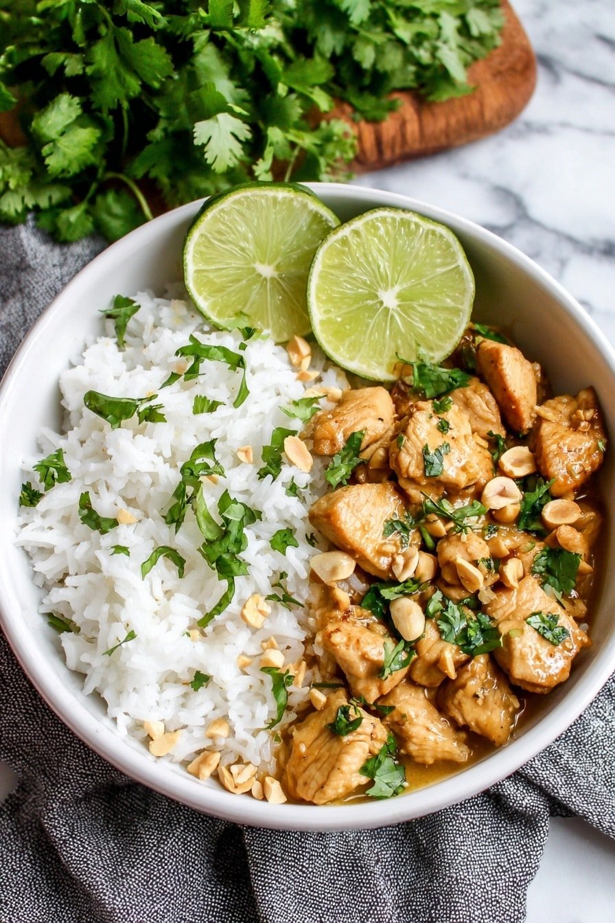 5. Serve the Peanut Chicken: After resting, transfer the chicken to serving plates. Serve it with cooked white or brown rice and the room temperature prepared peanut sauce. Garnish with lime wedges, whole or chopped peanuts, chopped green onions, and chopped cilantro as desired for added flavor and texture.