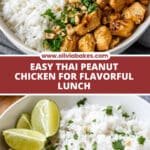 This Thai Peanut Chicken recipe features tender boneless skinless chicken thighs marinated in a flavorful, creamy peanut sauce made with coconut milk, lime, soy sauce, and aromatic spices. The chicken is then either broiled or grilled to perfection and served with optional rice, garnished with peanuts, green onions, and cilantro for a delicious and satisfying lunch.