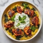 This Anti-Inflammatory Turmeric Chicken & Rice is a wholesome, flavorful one-pan meal featuring tender chicken breast cooked with aromatic spices like turmeric and paprika. The dish combines protein-rich chicken with fragrant jasmine rice, fresh spinach, and a zesty lemon finish, making it both nutritious and comforting. Optional Greek yogurt adds a creamy, cooling touch, perfect for a healthy weeknight dinner.